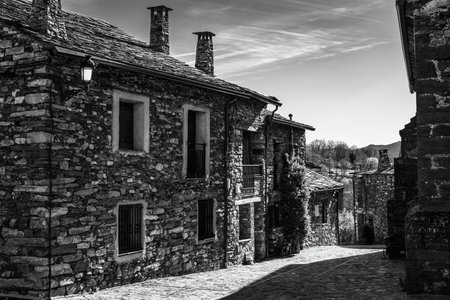 Old village with stone houses in the center of Guadalajara, Spain, black and white photo.