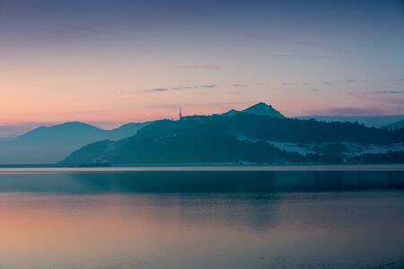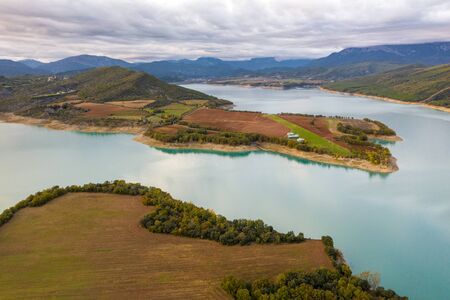 Aerial view of the Embalse de Mediano reservoir during sunset. Spain in the fall