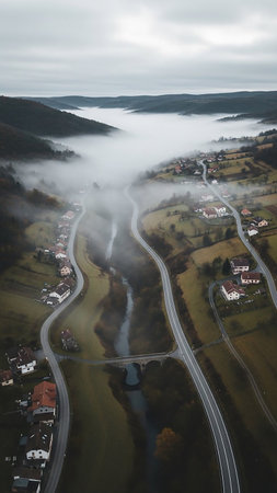 Villages showing aerial drone view of a misty valley with a winding river and road, surrounded by rolling hills and small villages under an overcast sky keywords:...