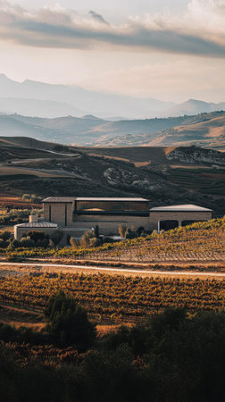 A vibrant sunset fills the sky with warm hues as it sets over the expansive vineyards. Rows of grapevines stretch out towards a charming farmhouse nestled in the hills.