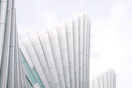 A close-up view of a modern building's exterior, showcasing its sleek, white, fan-like architectural design against a bright sky.