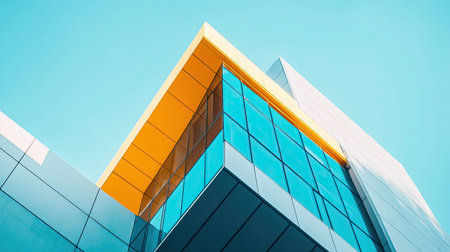 A striking capture of a modern architectural corner showcasing sleek lines and geometric precision set against a clear blue sky, embodying contemporary design aesthetics.