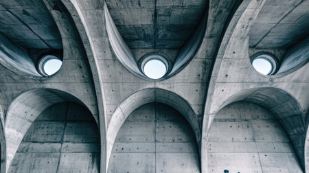 Stunning view of an artistic concrete architecture featuring arching ceilings and circular windows. The interplay of light and shadow creates an intriguing atmosphere.