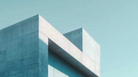 A sleek concrete building showcases minimalist design elements. The structure features clean lines and geometric shapes set against a backdrop of an empty sky enhancing its modern appeal.