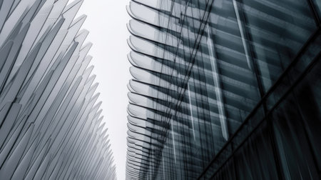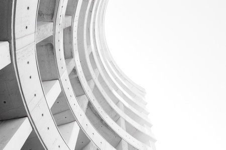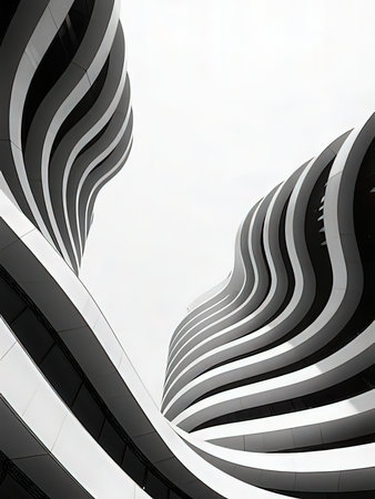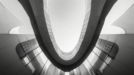 A symmetrical composition of bold curves and sharp angles highlights the precision and intricacy of a modern buildingsart.chitectural details. Black and white art.
