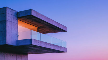 A contemporary building featuring a sleek concrete facade and glass balcony stands against a vibrant sunset sky. The blending colors create a captivating atmosphere