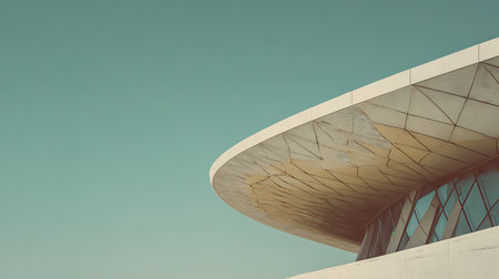 Low-angle shot reveals the geometric patterns of a modern architectural structure against a clear teal sky. The design incorporates triangular elements and curving lines.