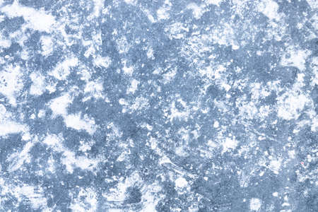 Macro photo of transparent light blue ice of frozen Baikal lake with white frost ornament. Beautiful winter nature background.