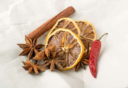 Dry spices for mulled wine with dehydrated sliced citrus on vintage kraft pack paper background. Winter oriental condiments such as dried lemon, cinnamon, red pepper and anise stars