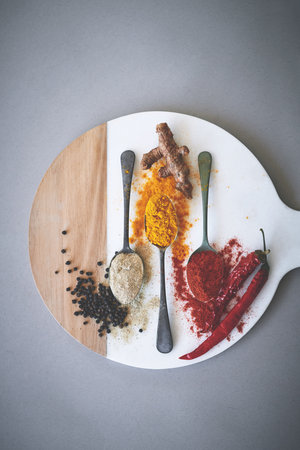 variation of spices on the vintage silver spoons, all spices on the table, colorful food background