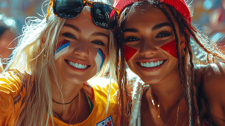 Cheerful celebration of two young women with painted faces showcasing team support and excitement at a sports event. They radiate enthusiasm and camaraderie in this dynamic portrait.