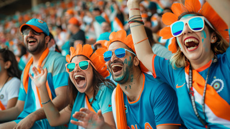 Netherland cricket fans are sitting in the cricket stadium wearing the jerseys of the Indian cricket team