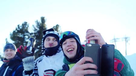 Group of young snowboarders on the slopes in sunny winter day taking selfie drinking beer and have great time