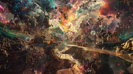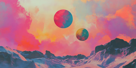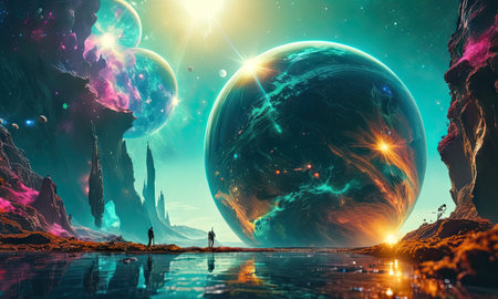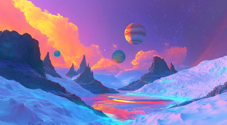 A stunning surreal landscape featuring vibrant colors and celestial bodies. The scene includes distant mountains, unusual trees, and an enchanting sky, evoking a sense of exploration and wonder.