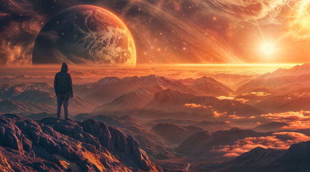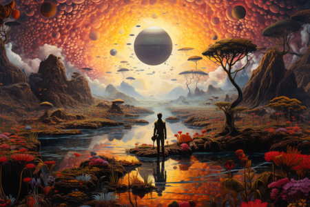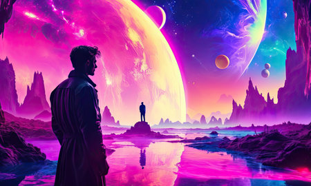 Painting of man standing in front of planets. Generative AI.