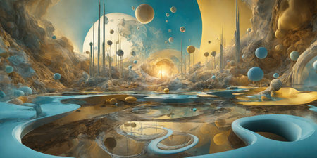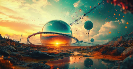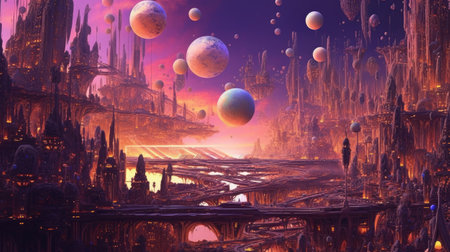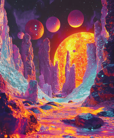 Stunning digital depicting an imaginative alien planet with glowing celestial orbs fiery molten landscapes and a dramatic cosmic atmosphere