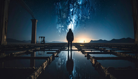 Star filled sky mirrored on Uyuni salt flats, geometric patterns, no light pollution. Surreal Salar de Uyuni concept.