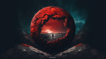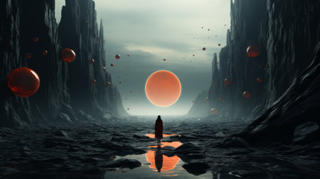 Image depicting an ethereal red-hued alien landscape with ancient ruins and a solitary figure, perfect for fantasy and sci-fi enthusiasts. AI generated