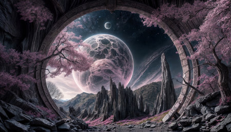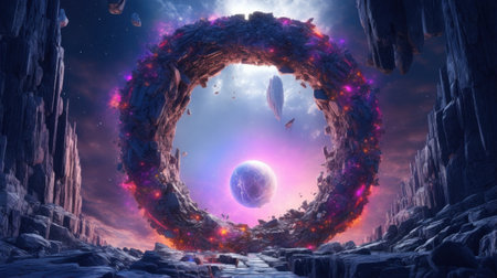 A celestial gateway opens to a vibrant planet amidst floating rocks in a cosmic landscape, ideal for sci-fi and fantasy themes. Fantasy illustration.