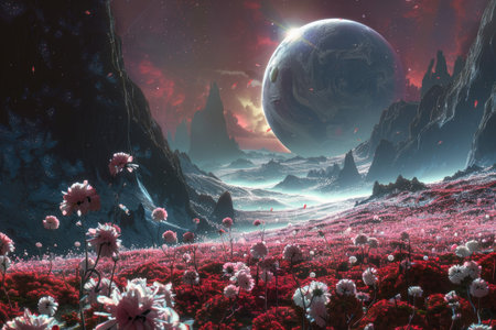 A depiction of a fantastical alien landscape with pink flowers blooming in a field against a backdrop of a large, glowing moon and distant mountains.