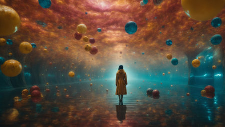 A man standing in front of a pond with many spheres, AI