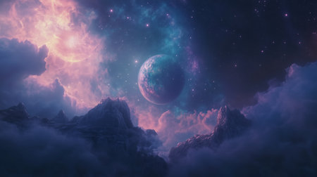 A celestial view of a distant planet surrounded by colorful clouds and starry sky at twilight