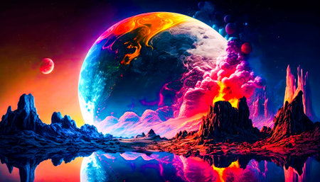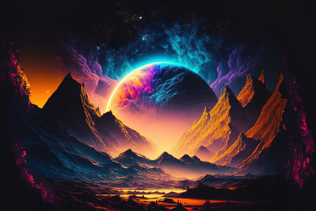 An image of colorful planet with mountains in the background. Generative AI.