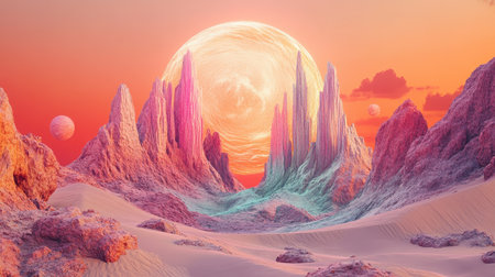 3D illustration of a fantasy landscape with mountains, moons and planets