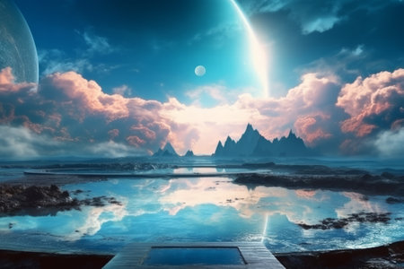 A mesmerizing and surreal cosmic scene featuring an exploding planet over a tranquil waterscape, reflecting the beauty of nature and the cosmos.