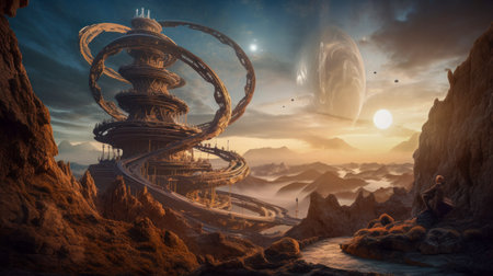 Alien extraterrestrial technology, DNA helix inspired architecture. Ancient astronauts and the origins of life on Earth. Abstract sci-fi illustration