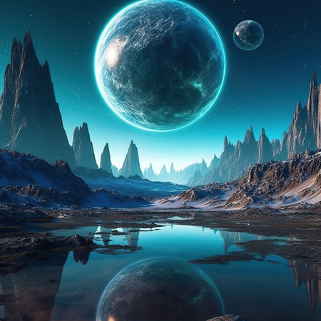 Futuristic landscape with mountains and planets. Generative AI.