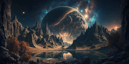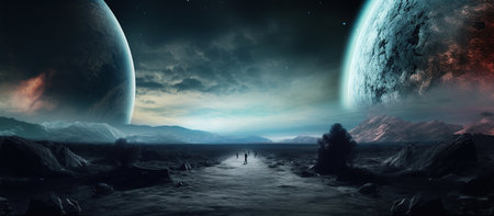 Fantasy landscape of a distant planet with a vibrant nebula and two moons