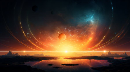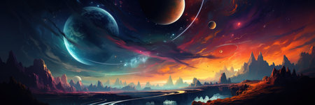 A breathtaking view of an alien landscape with multiple planets and stars in the background, creating a cosmic scene for space exploration themes. The vibrant colors of blue, purple, red, orange, and yellow create a mesmerizing atmosphere that evokes wonder at the vastness of outer space. --ar 78:43 --v 6.1 Job ID: 357cfaaa-854e-4b4d-a95e-222fbe0da247