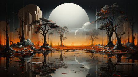 Fantasy landscape with a fantasy forest and a full moon.