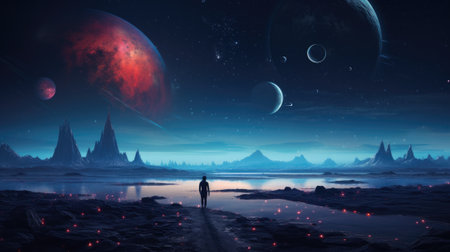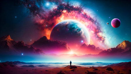 An AI generated illustration of a male in a desert with planets in the night sky in the background