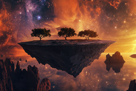 A surreal floating island features three trees against a vibrant cosmic background during twilight.