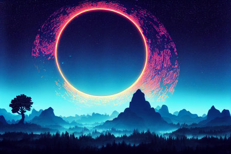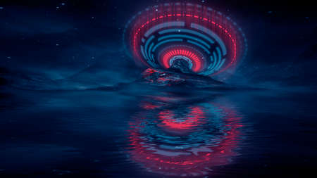 Neon landscape, night view. Futuristic fantasy night landscape with abstract landscape and island, moonlight, radiance, moon, neon. Dark natural scene with light reflection in water. Neon space galaxy portal.