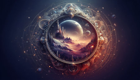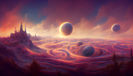 Space digital artwork. Surreal fantasy space. Nebula with planets stars. Science fiction elements. Glowing technologies. Dark colorful universe. Asteroids concept with moons stones vector illustration