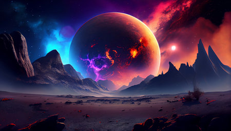 an alien planet with a colorful atmosphere, with a nearby star and a galaxy visible in the background. The surface of the planet is covered in strange, alien terrain