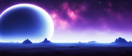 View on illuminated purple planet deep in outer space with nebula and stars in the sky. High resolution scientific illustration.