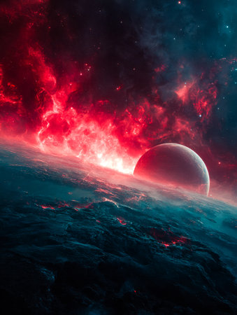A breathtaking cosmic vista features a luminous, far-off planet nestled within a swirling, colorful nebula, evoking awe and wonder in the vastness of space.