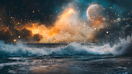 A colossal moon illuminates a rugged alien terrain, surrounded by cosmic nebulae and stars at night.