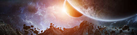 Panorama of a distant planet system from space during sunrise 3D rendering