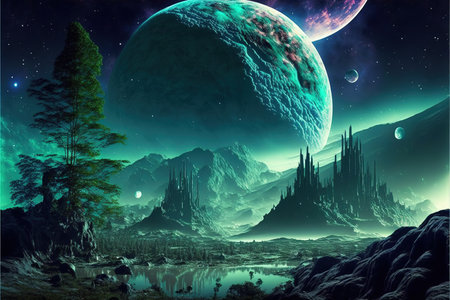 The planet is covered in lush, vibrant forests and towering mountains. the sky filled with strange, colorful clouds and multiple moons