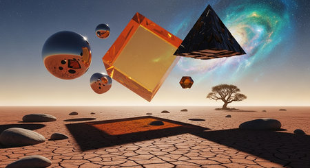 Suspended in a vibrant sky, a spaceship hovers above a surreal desert landscape with distant mountains.