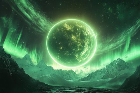 A stunning scene shows a glowing green planet against a night sky filled with auroras and mountains.