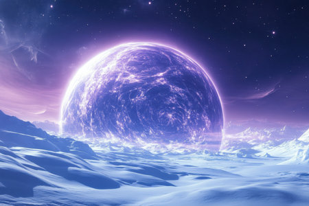 A stunning purple planet looms above a vast snowy terrain, illuminated by cosmic light, creating an ethereal atmosphere.