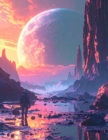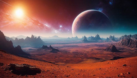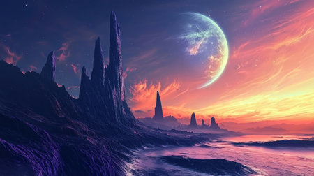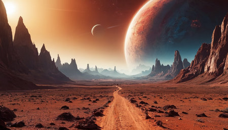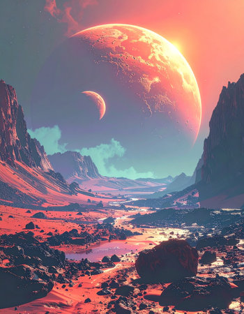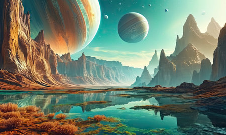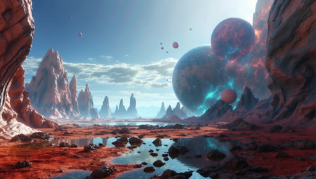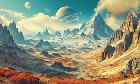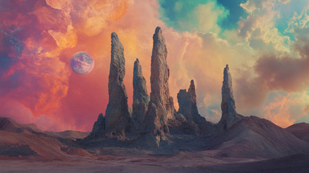 A desolate alien desert stretches out, marked by towering rock formations, under a surreal sky graced by the dramatic presence of nearby planets and celestial bodies. Resplendent.