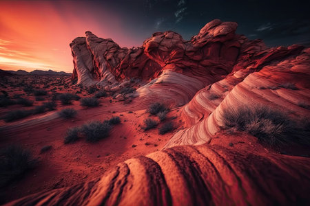 smooth curved red rock formations with tones of sunset sky, created with generative ai