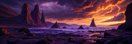 A surreal alien landscape features tall, dark rocks under a vibrant fiery sky with pink and purple hues.